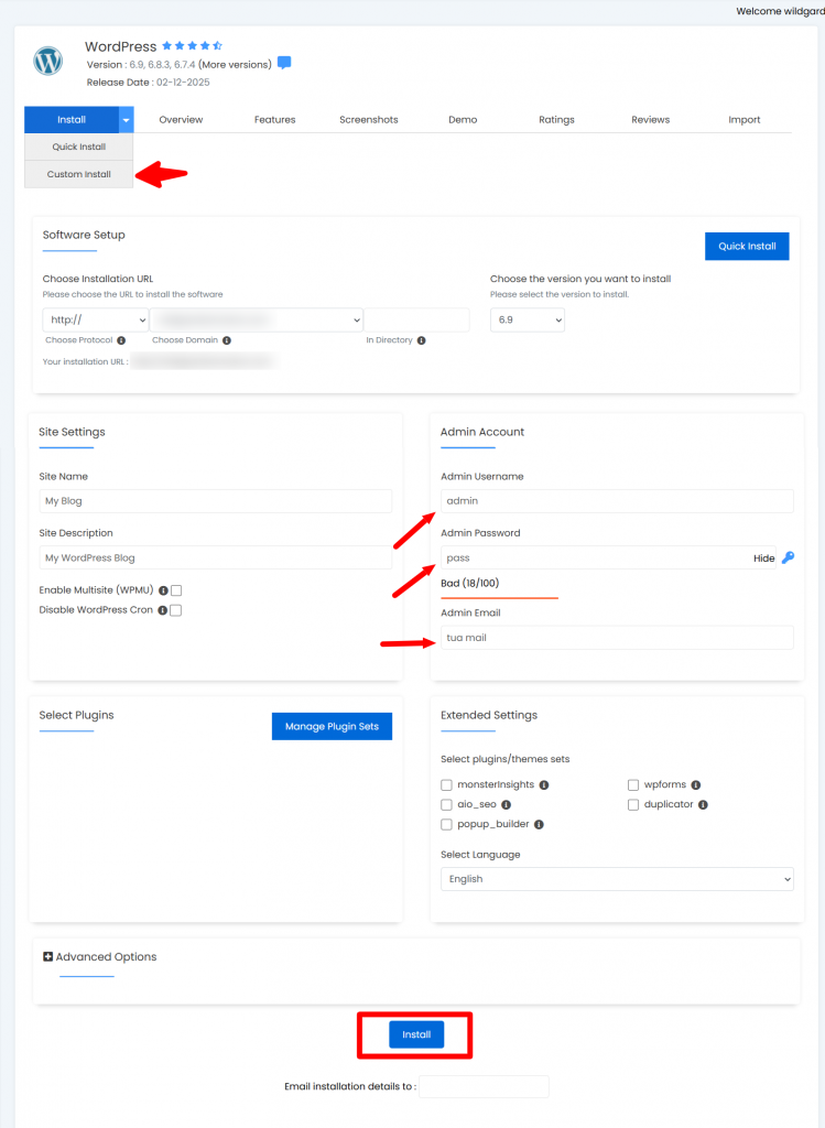 Ti chiederà se vuoi installare wordpress, scegli “custom Install” per fare la tua installazione personalizzata per il tuo sito porno.