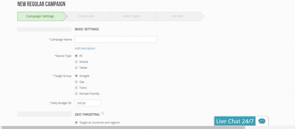 In questa sezione dovrai dare un nome alla tua campagna porno, scegliere il tipo di dispositivo, il target ( straight, gay ecc) ed infine impostare il budget giornaliero. Fatte queste impostazioni dovrai impostare il GEO ovvero il paese dove vuoi che la tua campagna porno sia attiva.