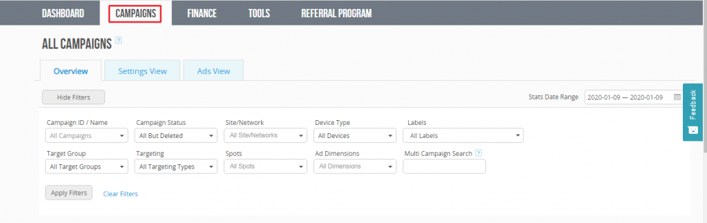 Campagne: qui hai una panoramica generale di tutte le tue campagne, ed è diviso in tre sezioni : Overview (Panoramica) , Settings View (impostazioni e visualizzazioni) e per finire Ads View (visualizza annunci) . Dove hai la sezione panoramica hai la possibilità di selezionare i filtri e cercare le tue campagne nel caso tu ne abbia molte.