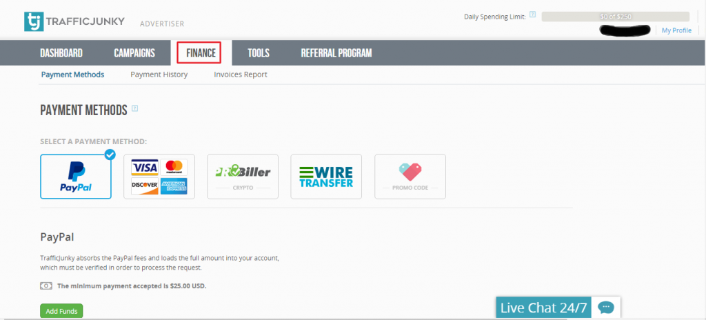 – Metodi di Pagamento : Trafficjunky accetta Paypal (deposito minimo 25 usd), carte di credito (Visa/Mastercard/Amex deposito minimo 100 USD), Probiller (deposito minimo 250 USD) , Bonifico bancario (deposito minimo 1000 USD) , e la possibilità di inserire un codice promozionale.