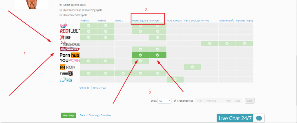 Confermando i dati descritti prima ti ritroverai a selezionare i siti dove vuoi sponsorizzare la tua pubblicità porno 1) troverai i siti a disposizione 2) In verde il sistema ti consiglierà dove fare le ads poi selezionare o deselezionare a tuo piacimento 3) dove apparirà la tua pubblicità, quando hai impostato tutto seleziona next step.