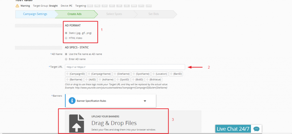 In questa sezione del programma di Trafficjunky 1) dovrai selezionare se la tua pubblicità e un banner porno in un formato immagine oppure video, 2) dovrai inserire l’URL del programma di affiliazione oppure del tuo sito per adulti, 3) dovrai inserire l’immagine o banner.