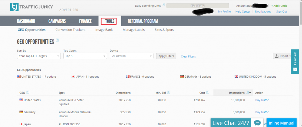 – GEO Opportunities : Qui ti mostrano quali sono i paesi dove ci sono più probabilità per la tua campagna abbia successo, le dimensioni dei banner, il prezzo e le impression che riceve quel banner con quelle dimensioni.