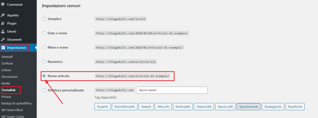 Entrando nel tuo sito per adulti in WordPress dovrai andare in Impostazioni > Permalink e selezionare la voce “nome articolo” come vedi nell’immagine.
