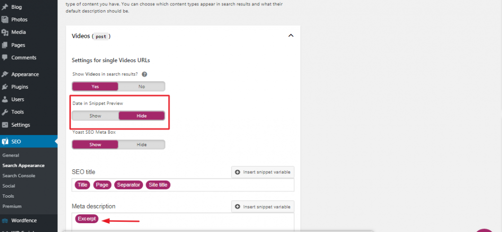 Dopo averlo installato e fatto la prima configurazione ti troverai l’icona alla tua sinistra del tuo sito per adulti in WordPress. Dovrai impostare la configurazione di come apparirà il titolo dei vari video su google, ti basterà andare su Yoast Seo > search appearance > General , qui avrai la possibilità di cambiare a tuo piacimento come vuoi che appaia il nome tuo sito nelle ricerche di google, a me piace il separatore, decidi tu quale può essere il migliore per il tuo sito per adulti. Sotto dove vedi scritto “meta description” dovrai inserire la descrizione generale di cosa parla il tuo sito , facendo attenzione nell’inserire parole chiave in target con il tuo sito porno, il risultato lo puoi vedere qui sotto