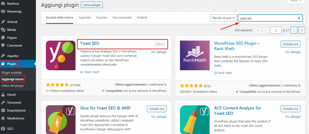 Dal tuo sito WordPress dovrai andare nella barra di sinistra e trovare : Pluging > Aggiungi Nuovo > e cercare ” Yoast Seo” , fai l’installazione e attivalo.